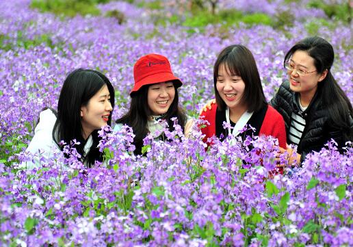 2019年4月6日,游人在湖北省宜昌市夷陵区黄花镇上洋村生态农业观光园的田园花海里赏花。2019年清明小长假期间,全国各地文化和旅游产品丰富,民众