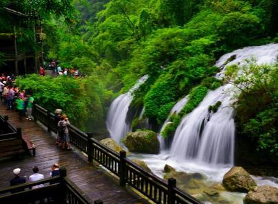 三峡竹海生态风景区自然景观融山、水、竹、树、洞、瀑为一体,被誉为“三峡地区的天然氧吧”。景区内茂林修竹、曲径通幽、小桥流水、山峦叠嶂、飞瀑蒸腾,仿若人间仙境。万亩翠竹连绵不绝,有风拂过,竹浪如海;圣水湖清澈见底,倒影小桥楼台、山影天色;五叠水瀑似自天边直挂谷底,雾气冲天、彩虹横跨,尤为壮观。